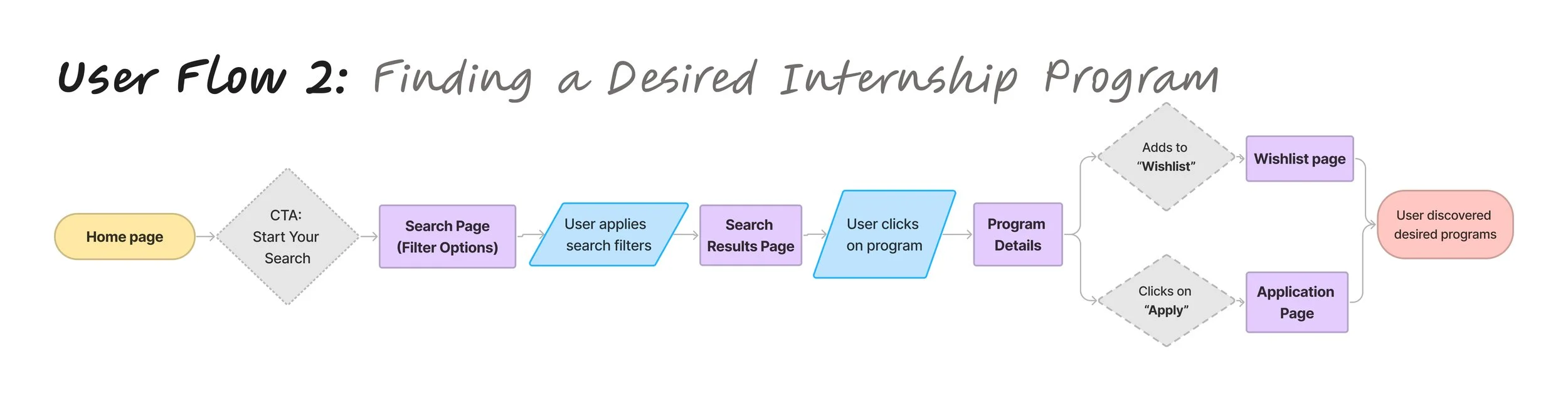 I established 3 essential user flows to address the key touch points in the user’s journey. This consists of the user onboarding, finding an internship program and applying